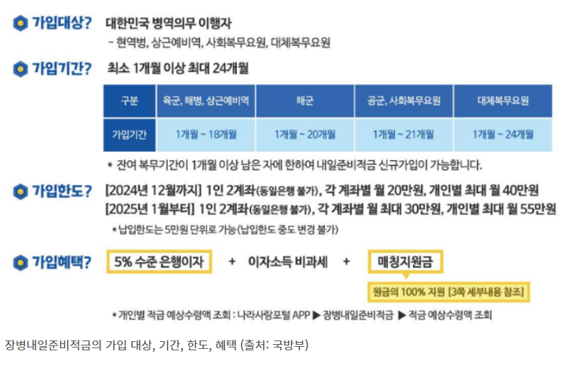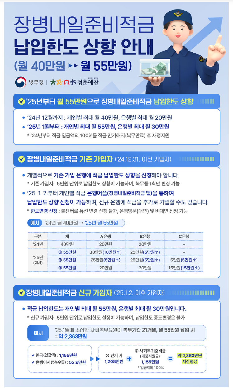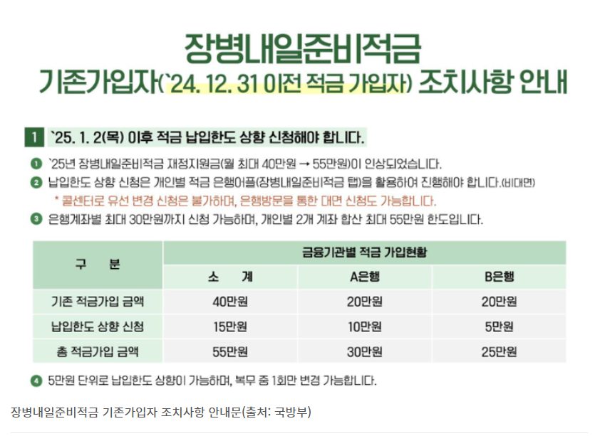 - '25. 1. 2.부터 개인별 적금 은행어플(장병내일준비적금 탭)을 통하여 납입한도 상향 신청이 가능하며, 신규 은행에 적금을 추가로 가입할 수도 있습니다.