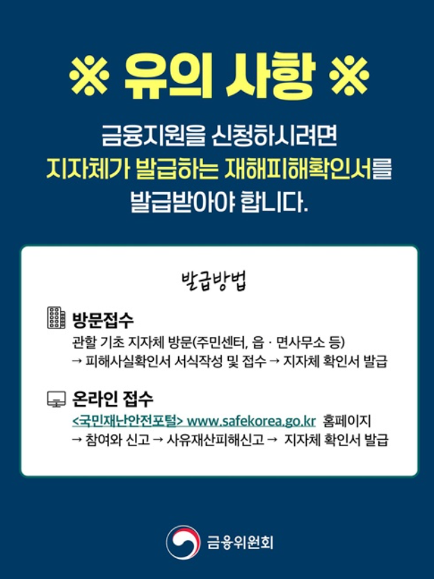 # 주의 # 재해 관련 금융지원을 사칭한 전화나 문자에 속지 않도록 주의하세요.