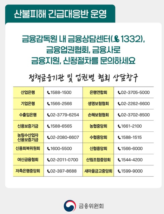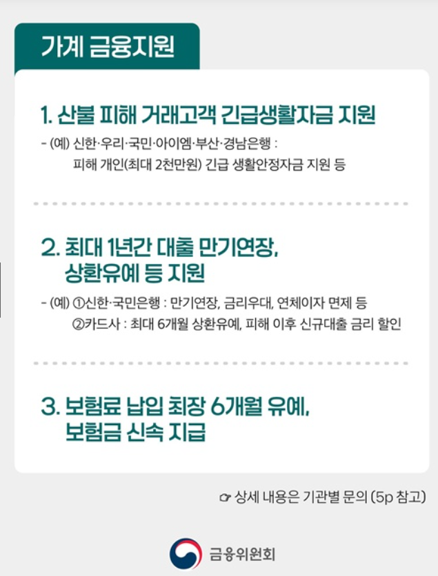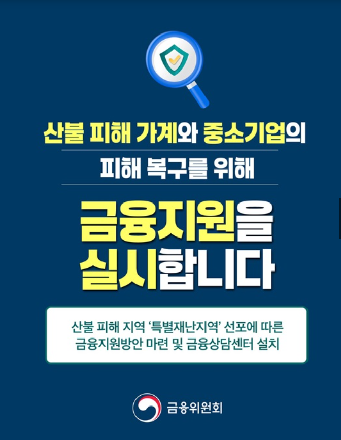최근 발생한 산불로 피해를 입으신 분들을 위해 정부와 금융기관이 특별한 지원책을 마련했습니다.
