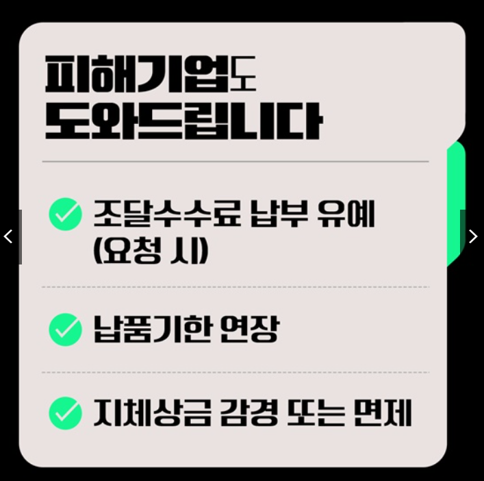 조달수수료 납부를 유예하고(요청 시), 납품기한을 연장하며, 지체상금을 감경하거나 면제합니다.