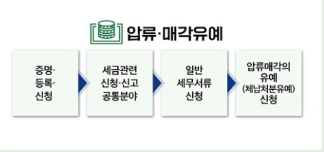 '압류매각의 유예(체납처분유예) 신청서'를 작성하여 제출하면 되며,