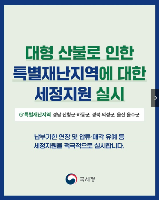 산불로 인해 큰 피해를 입은 지역 주민들을 위해 국세청에서 다양한 세금 납부 혜택을 제공합니다.