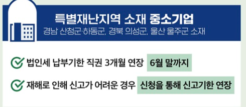 산불로 피해를 입은 특별재난지역에 사는 분들은 법인세, 부가가치세, 종합소득세 등