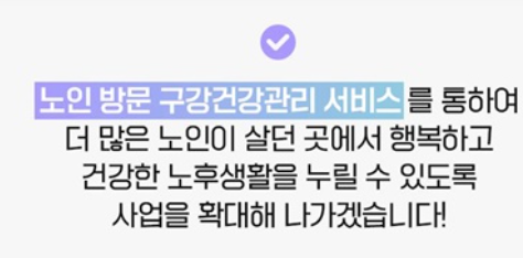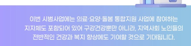 특히, 이번 시범사업에는 의료·요양·돌봄 통합지원 사업에 참여하는 지자체도 포함되어 있어 구강건강뿐만 아니라, 지역사회 노인들의 전반적인 건강과 복지 향상에도 기여할 것으로 기대됩니다. 의료·요양·돌봄 통합지원 사업은 일상생활에 어려움을 겪는 사람이 살던 곳에서 건강한 생활을 영위할 수 있도록 시·군·구가 중심이 되어 돌봄 지원을 통합·연계하여 제공하는 사업으로, 2026년 3월에 본사업 시행이 예정되어 있습니다.
