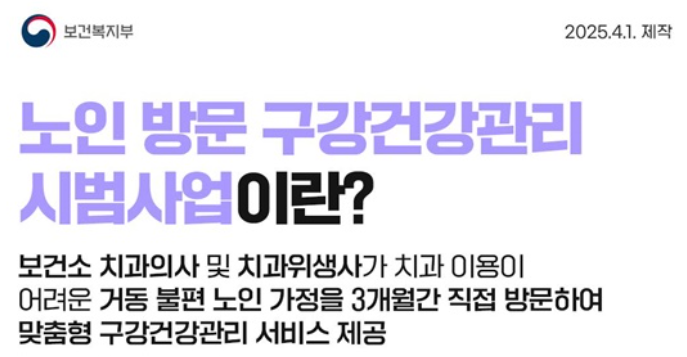 보건복지부와 한국건강증진개발원이 2025년 4월부터 전국 29개 시군구 보건소에서 65세 이상 재가 노인을 대상으로 '방문 구강건강관리 시범사업'을 처음으로 시작합니다. 이 사업은 거동이 불편한 노인들의 가정을 보건소 치과의료인력이 직접 방문하여 맞춤형 구강관리 서비스를 제공하는 사업입니다.