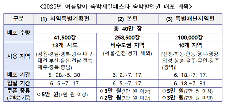 '2025 대한민국 여름맞이 숙박세일페스타'는 국민 여러분의 여행비용 부담을 줄이고 지역경제에 활력을 불어넣기 위한 뜻깊은 행사입니다. 총 40만 장의 할인권이 준비되어 있지만, 선착순으로 소진되면 발급이 종료되니 서둘러 참여하세요.