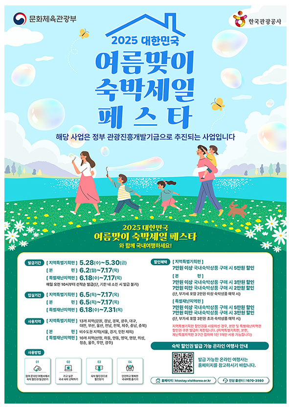 문화체육관광부와 한국관광공사가 여름 휴가철을 맞아 '2025 대한민국 여름맞이 숙박세일페스타'를 5월 28일부터 시작합니다. 총 40만 장의 숙박할인권으로 최대 5만원까지 할인받을 수 있는 절호의 기회! 국내 여행 계획이 있으시다면 꼭 확인해보세요.