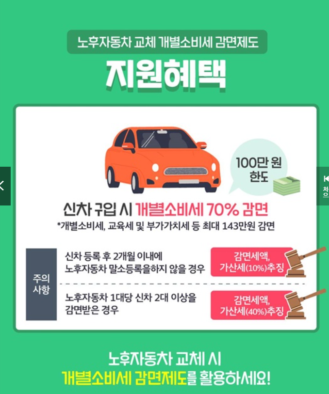 이 혜택은 환경 보호와 자동차 산업 활성화를 위한 정책으로, 연비가 낮고 배출가스가 많은 노후차를 친환경 신차로 교체하도록 유도하는 것이 목적입니다. 동시에 소비자에게는 큰 경제적 혜택을 제공합니다.