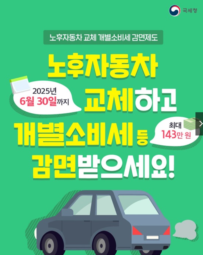 10년 이상 된 노후자동차를 신차로 교체하면 최대 143만원의 세금 감면 혜택을 받을 수 있습니다. 2025년 6월 30일까지 한정된 이번 기회를 놓치지 마세요!