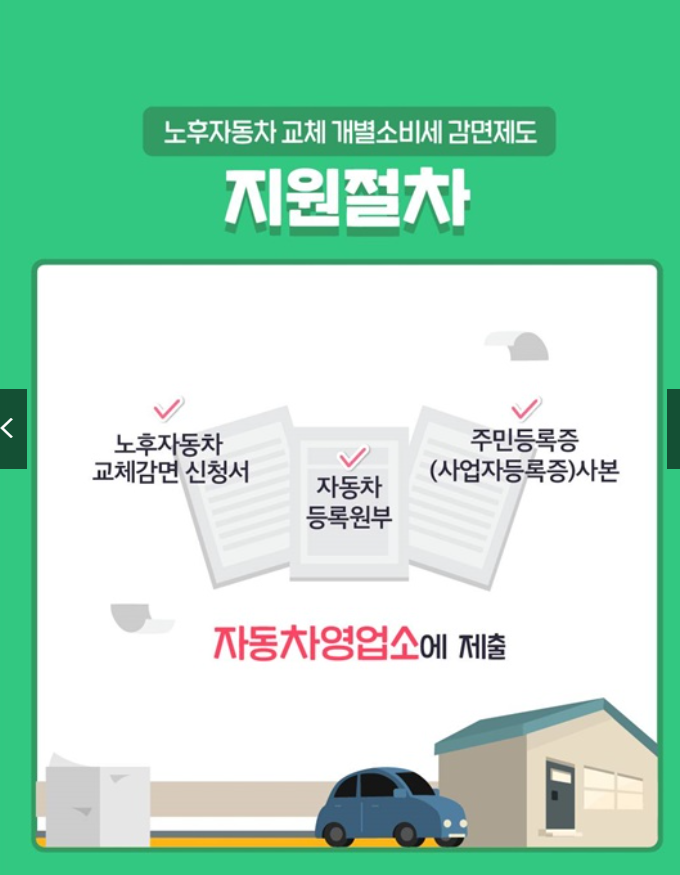 신청 서류는 노후자동차 교체감면 신청서, 자동차 등록원부, 주민등록증(사업자등록증) 사본 3가지만 준비하면 됩니다. 자동차영업소에서 신차 구매 시 함께 제출하면 간단하게 처리됩니다.