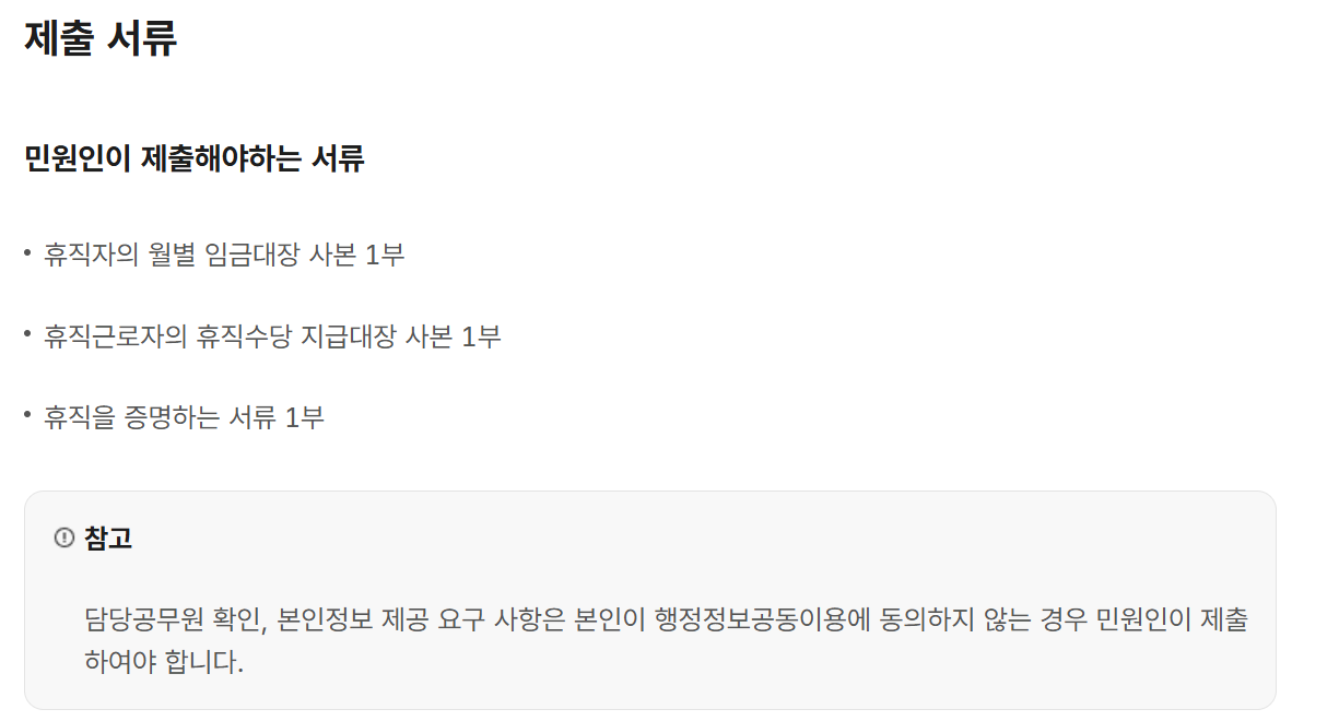 휴업·휴직이 끝났다면, 다음 달 말일까지 지원금을 신청해야 해요. 준비할 서류는 다음과 같아요: